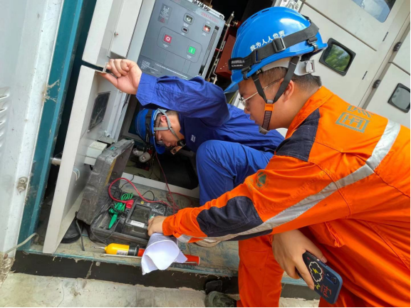 李刚(穿橙衣者)正在检测受损设备的绝缘性能