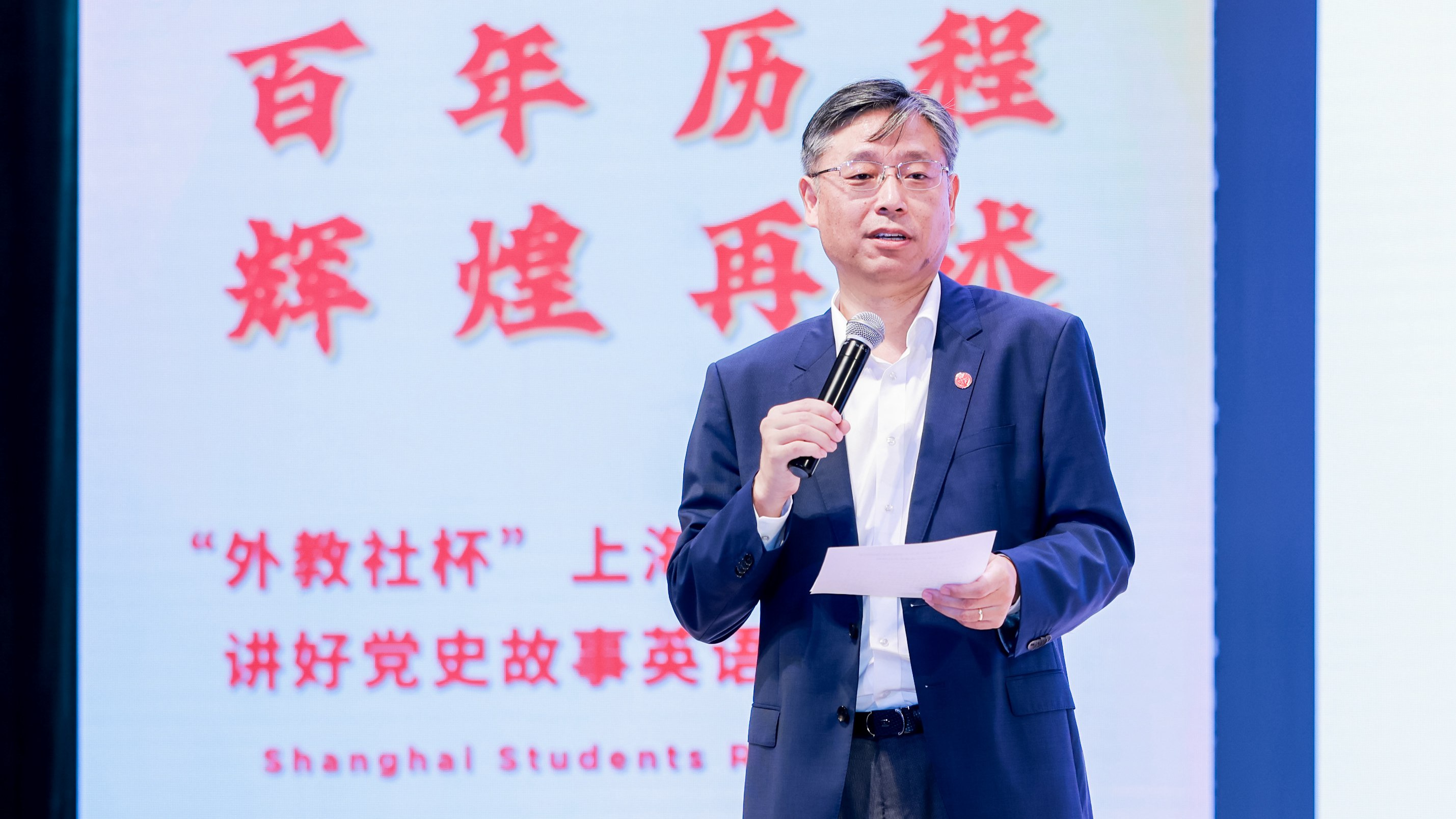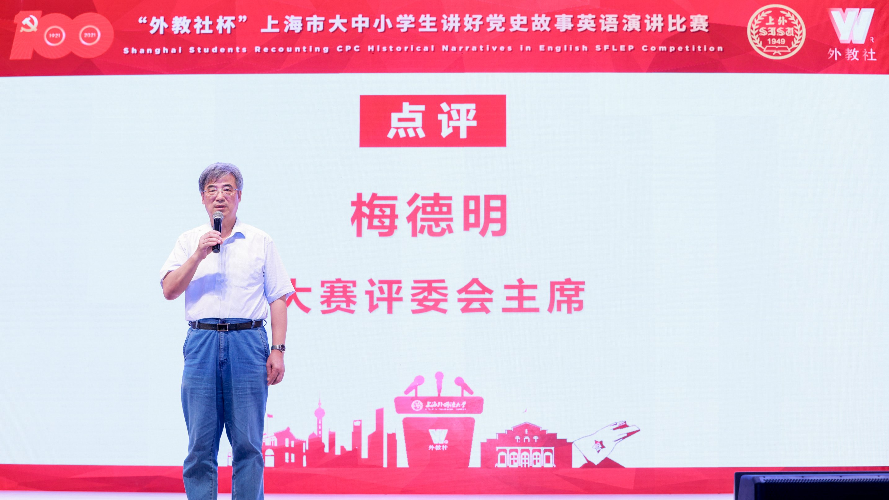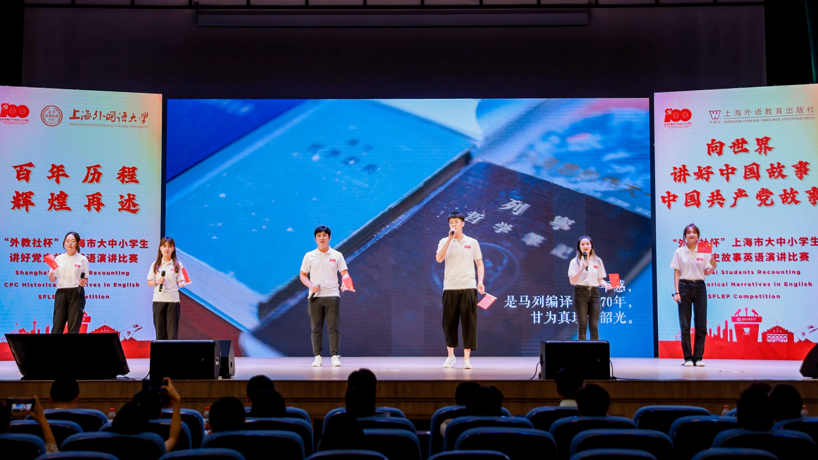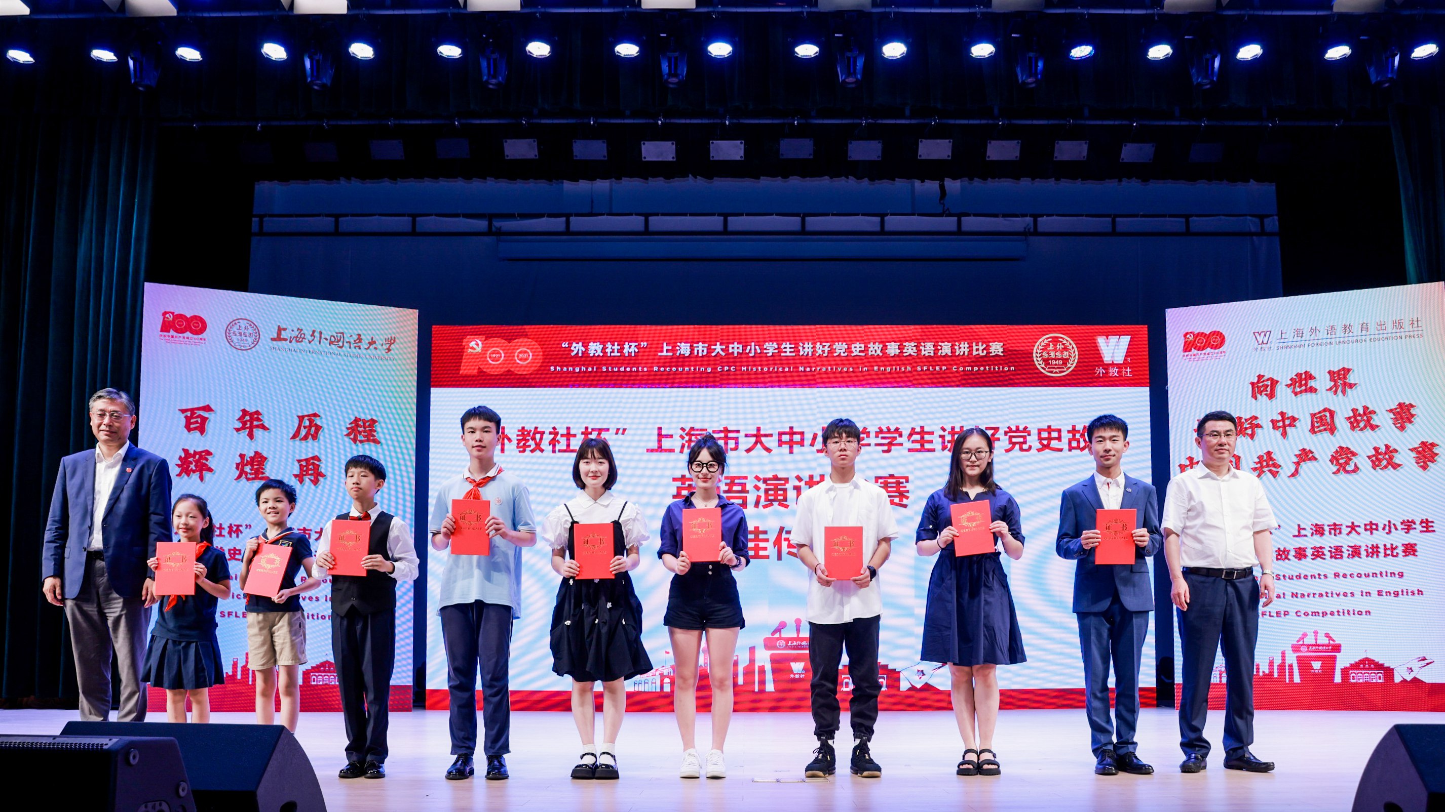 为庆祝中国共产党成立100周年,统筹推进大中小学思政一体化建设,7月20日,上海市大中小学生讲好党史故事英语演讲比赛颁奖典礼在上外举办,活动由中共上海市教育卫生工作委员会、上海市教育委员会指导,上海市学生德育发展中心和上海外国语大学共同主办,上海外语教育出版社承办。