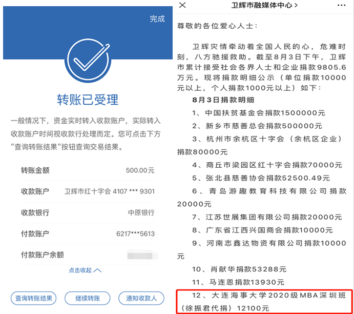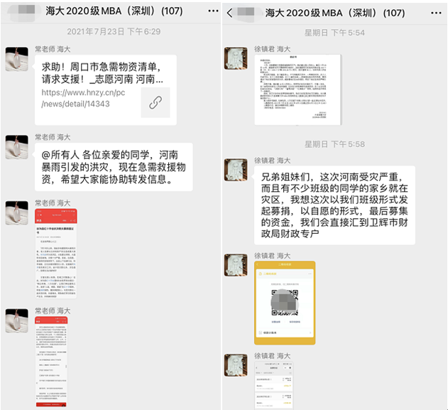 危难时刻,大连海事大学深圳研究院的常崇娟老师,第一时间将河南急需救援物资的信息转发到海大各年级微信群里,并转发到朋友圈,海大深圳MBA班的同学们也纷纷转发,发挥各自的力量,发动身边的亲友,让更多的人看到一些灾区急需物资的信息。