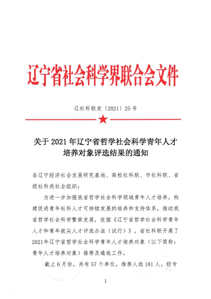 8月4日,辽宁省社科联发布了《关于2021年辽宁省哲学社会科学青年人才培养对象评选结果的通知》,本次评选共有57个单位推选的181人参评,其中87人获评第一批青年人才培养对象。