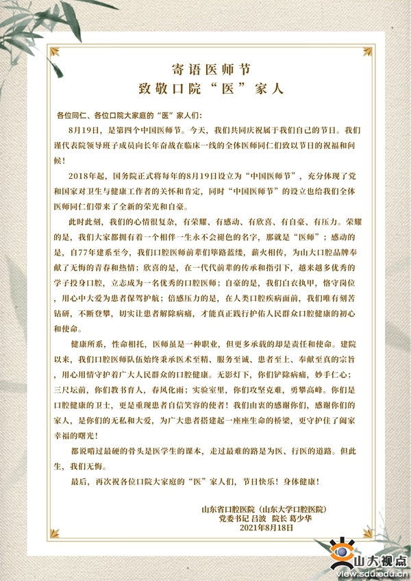 在医师节到来之际,口腔医院给全院医师写了慰问信,向所有坚守在临床一线、护佑人民口腔健康的医师们致以崇高敬意。