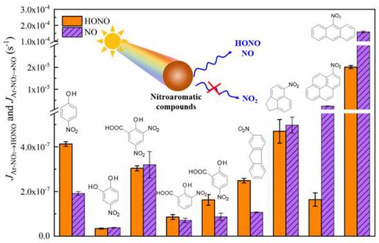 该项研究证实了大气气溶胶中典型棕碳类物质硝基芳香化合物的光解过程能够产生HONO和氮氧化物,定量分析结果表明硝基苯酚和硝基多环芳烃光解生成HONO的光解率分别为(0.34-4.16) × 10−7和(0.02-2.01) × 10−5 s−1,提出了NACs光解反应生成HONO和NOx的机理。该论文结果将为准确评估NACs光解过程对白天大气环境中HONO来源的贡献提供重要计算依据。