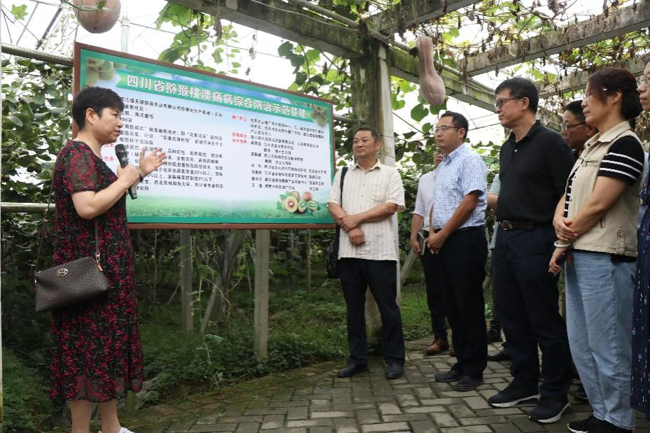 在都江堰胥家镇猕猴桃溃疡病综合防治示范基地和猕猴桃褐斑病综合防治示范基地,专家组实地调研了项目的示范应用效果。龚国淑教授详细介绍了示范基地的建设情况和猕猴桃病害综合防治技术取得的成效。她表示,猕猴桃溃疡病已成为制约都江堰乃至全省猕猴桃产业健康发展的重要因素。2012年,我校植物保护学系开始在都江堰地区展开猕猴桃溃疡病、褐斑病等猕猴桃重大病害的相关研究,与西北农林科技大学、四川省农业科学院、四川省自然资源科学研究院等科研院所携手攻关,集成了“以提升植物抗病力为基础,以‘两前两后’精准施药技术为核心,以避雨栽培为特色”猕猴桃溃疡病高效防控技术体系,推广应用后病害防控效果显著,2021年该示范园亩产达4000斤,每亩产值约48000元,实现了有效增收。目前该技术体系在四川苍溪、蒲江、都江堰等地推广应用面积达50万亩。