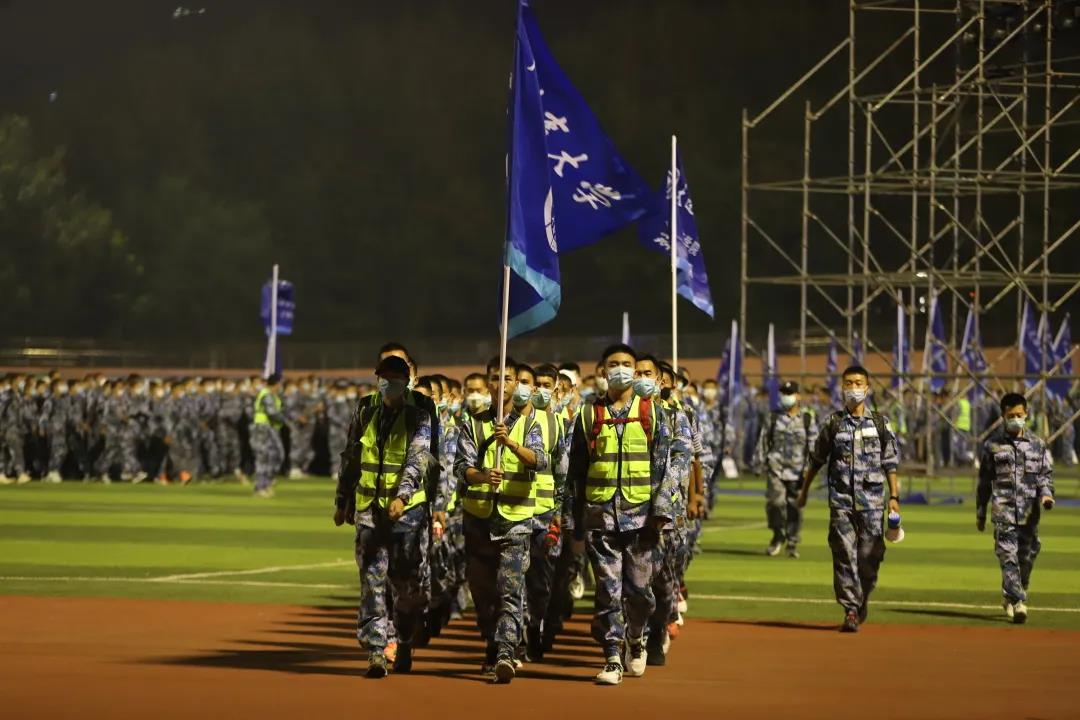 雄关漫道,旗映赤心,新生同学们身着迷彩,整装出发,井然有序地行进。队伍前有尖刀班负责前哨及路口疏导等工作,控制队伍行进速度;队伍后有保障组负责提供收容保障支持。学生工作干部、军训教官始终在队伍中跟随行进,时刻注意学生们的安全。各单位协同配合,交通管制、路口疏导、医疗保障等工作有条不紊。