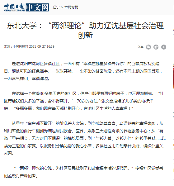 张雷教授作为沈阳市政协委员,在政协会议上提案建议在沈阳全市范围内深入践行“两邻”理念,深入推进全市基层社会治理创新,受到了相关主要领导的重视。2021年5月17日,中共沈阳市委办公室、沈阳市人民政府办公室联合下发了《沈阳市深入践行“与邻为善、以邻为伴”理念 推进城乡社区治理现代化专项行动方案》(以下简称《方案》),开始在全市范围内深入践行“两邻”理念,进一步推进沈阳市基层社会治理现代化工作。文法学院李国青老师在参与相关文件起草论证工作中,提出了“四互”“四共”“四和”的建议和理论阐释,被《方案》所采纳。
