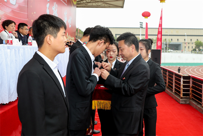 开学典礼在庄严肃穆、慷慨激昂的国歌声中拉开帷幕。校党委书记杨涛为2021级新生代表佩戴校徽,一枚小小的校徽代表了学校的历史与文化,承载着西财大人的光荣与使命。