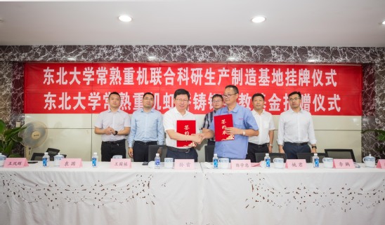 继续教育培训网首页9月27日上午,东北大学常熟重型机械制造有限公司联合科研生产制造基地挂牌仪式暨“常熟重机虹桥铸钢”奖教基金捐赠仪式在常熟举行。常熟重机董事长陈学忠,江苏常熟高新技术产业园招商局局长姚君,中国工程院院士王国栋,东北大学副校长孙雷出席会议并共同为基地挂牌。东北大学对外联络与合作处、轧制技术及连轧自动化国家重点实验室等相关部门负责人和常熟重机部分员工参加签约仪式。