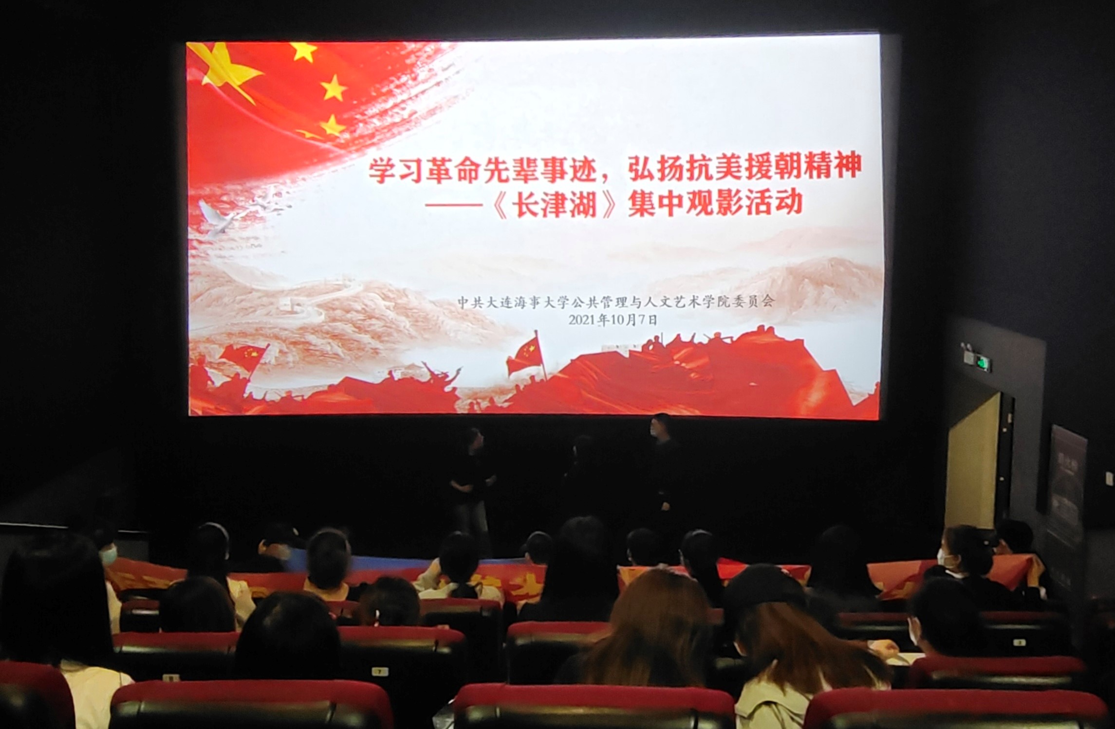 为庆祝党的百年华诞,丰富党史学习教育形式,公共管理与人文艺术学院于10月7日组织学院师生党员开展“学习革命先辈事迹,弘扬抗美援朝精神”主题观影《长津湖》活动。学院领导班子,师生党员、积极分子代表参加活动。