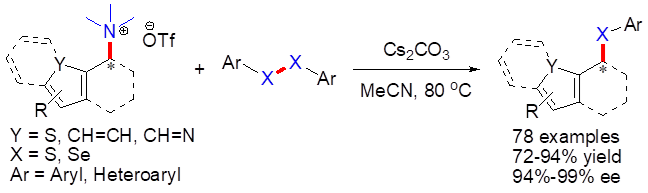 季铵盐作为一种新型的亲电试剂,性质稳定,无特殊气味,可以在无金属条件下与二硫(硒)化物,高效构建普通硫醚、硒醚等化合物。不仅如此,采用具有手性的季铵盐作为亲电试剂,还可以手性保留得到具有手性的硫醚、硒醚等重要结构。此策略绿色无污染,对环境友好,在药物合成领域具有十分重要的意义。
