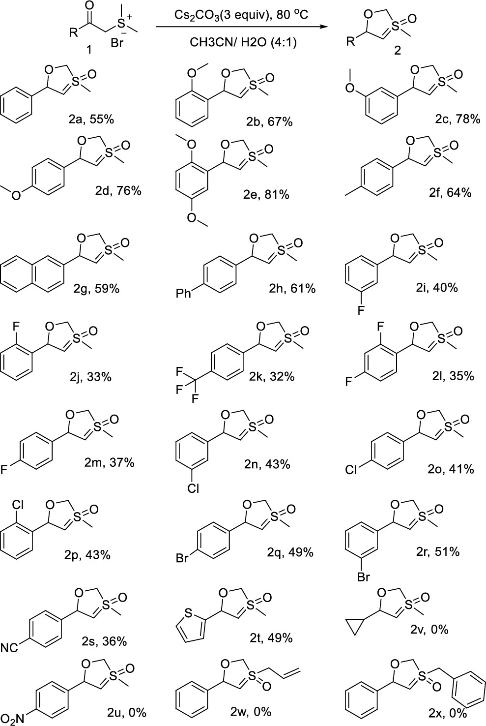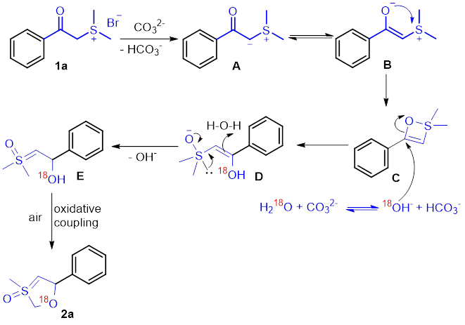 在实验研究中,曾庆乐课题组偶然发现由苯甲酰亚甲基二甲基锍盐原位生成的α-羰基硫叶立德在水和乙腈的混合溶液中发生新奇的分子内环化/氧化反应(图2),得到一类含亚砜叶立德结构的五元杂环新类型化合物。