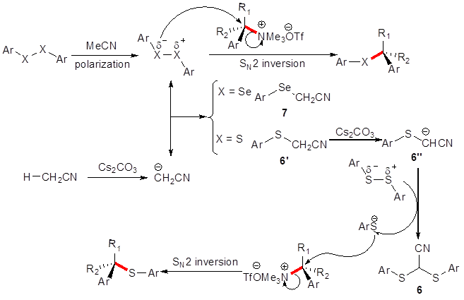 在长期研究有机硫族化学基础上,曾庆乐课题组发现无过渡金属催化的苄位硫醚(硒醚)的合成方法(图5)。苄位三甲基季铵盐在碳酸铯的作用下,在乙腈中分别与二芳基二硫化物、二硒化物反应,得到苄位硫醚、苄位硒醚。