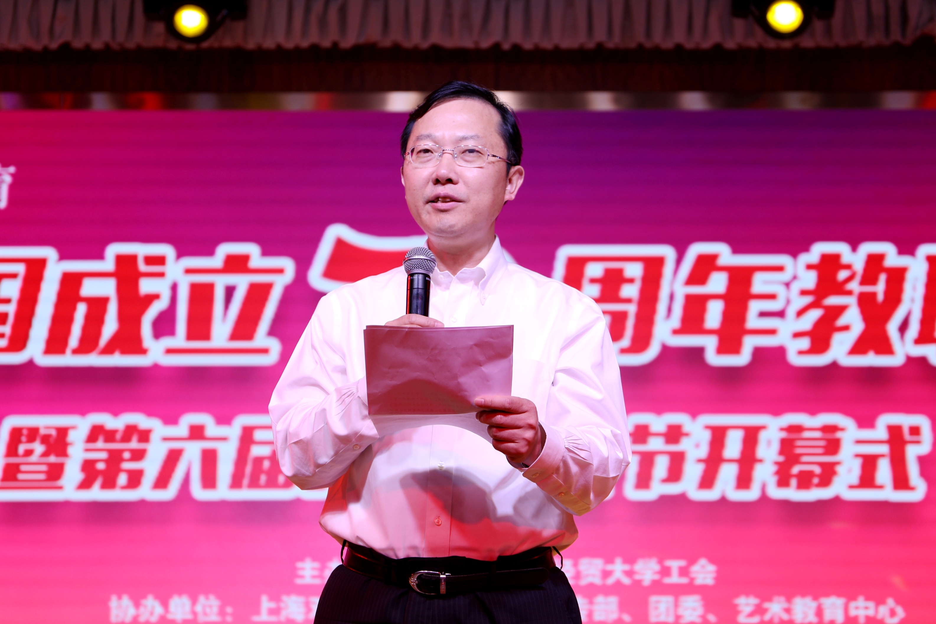 汪荣明在开幕式上致辞。他指出,新中国成立70年来,中国共产党带领中国人民经历了从站起来到富起来、再到强起来的历史性飞跃。我们正按照党的十九大制定的战略部署谱写史诗般的鸿篇巨制,以“扶摇直上九万里”的气魄,铿锵前行。在这个具有特殊意义的时刻举行庆祝新中国成立70周年教职工合唱比赛,以自信嘹亮的歌声表达对祖国的美好祝福,并以此拉开学校第六届文化艺术节的帷幕。我校始终秉承“以学生为本、以学术为魂”的办学理念和“诚信、宽容、博学、务实”的校训精神,一代代上经贸大人奋发图强、锐意进取,为学校事业发展奠定了坚实的基础。校园文化赋予学校深厚的底蕴,艺术展演给予校园灵动的精神升华。学校一直高度重视校园文化建设,每年的校园文化艺术节也是学校师生展现精神风貌和艺术才华的舞台。他希望大家以饱满的热情、嘹亮的歌声,抒发豪情壮志,礼赞伟大祖国70年的辉煌成就,进一步凝心聚力、振奋精神,把爱国热情转化为推动学校改革创新转型发展的动力。