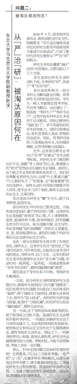 2020年9月,国务院学位委员会、教育部联合印发文件,明确要求“对不适合继续攻读学位的研究生要及早按照培养方案进行分流退出”,凸显了新时代研究生教育从“严”治“研”的特点。