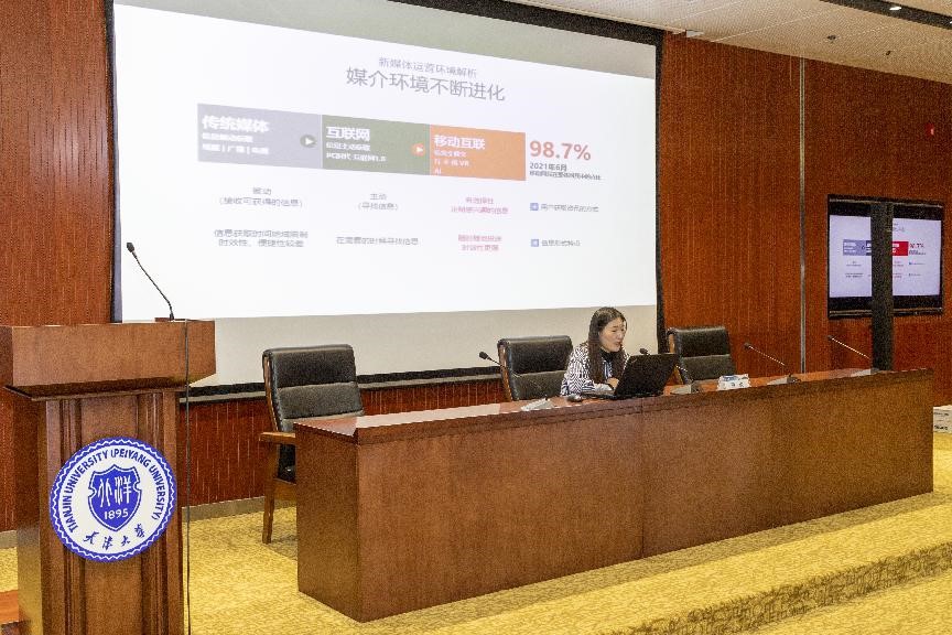 之后,特邀嘉宾、新浪天津新媒体运营主管贾璐为现场师生带来了题为《新媒体 新趋势——高校新媒体破圈计划》的专场讲座,介绍了当下网络新媒体环境的特点与内容趋势、高校新媒体阵地建设热点案例、校园官微运营技巧,并就如何成为一名“网红”校园博主与师生进行了分享交流。