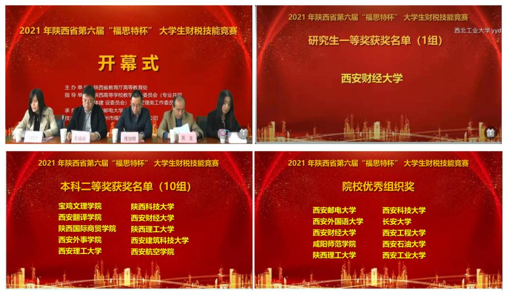 继续教育培训网首页10月23日,2021年陕西省第六届“福斯特杯”大学生财税技能竞赛在西安邮电大学拉开帷幕,西安交通大学、西北工业大学、陕西师范大学、西安财经大学等40多所高校选手参加比赛。经过激烈角逐,我校荣获团队一等奖、二等奖、优秀组织奖各一项,商学院教师徐润芳、徐玮、徐维兰和贡晓军荣获“优秀指导老师”荣誉称号。
