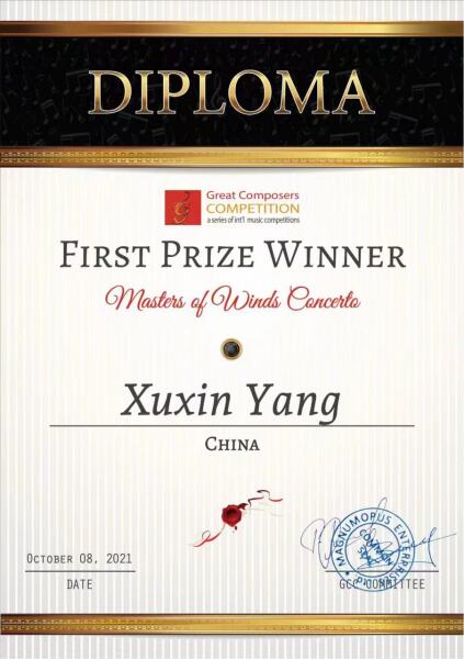 管弦系萨克斯管专业硕士研究生二年级杨旭新同学荣获2021年第六届杰出作曲家比赛-管乐协奏曲大师比赛