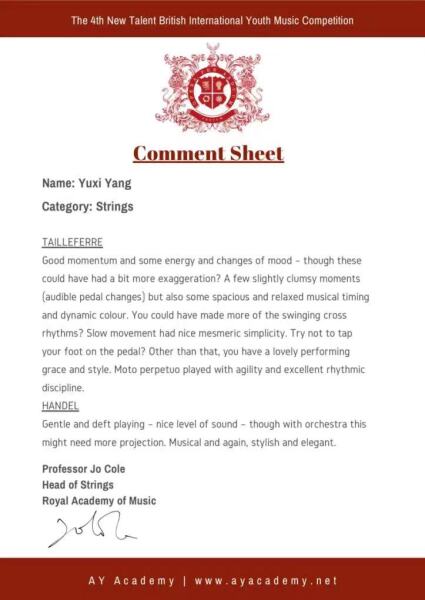 2021年英国伦敦“艺术家大奖赛”国际音乐比赛9-12岁组一等奖,并受邀去伦敦皇家阿尔伯特大厅参加获奖音乐会。