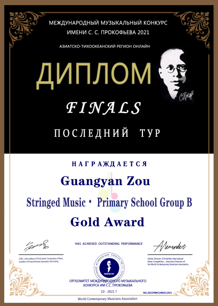 2021荣获年普罗科菲耶夫国际音乐大赛亚太区线上弦乐小学B组银奖。