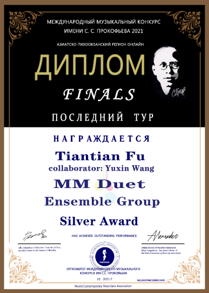 2021年荣获普罗科菲耶夫国际音乐大赛亚太区线上弦乐中学A组银奖(金奖空缺)。