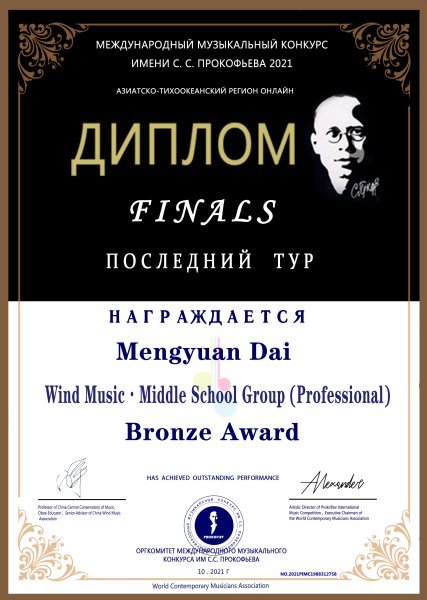 *2021年普罗科菲耶夫国际音乐大赛亚太区专业中学组金奖;