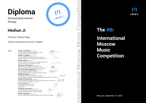 纪贺顺获得第四届莫斯科国际音乐比赛弦乐组第二名证书。指导教师王绍武教授。