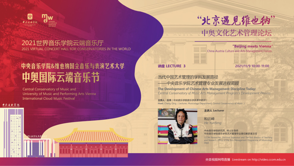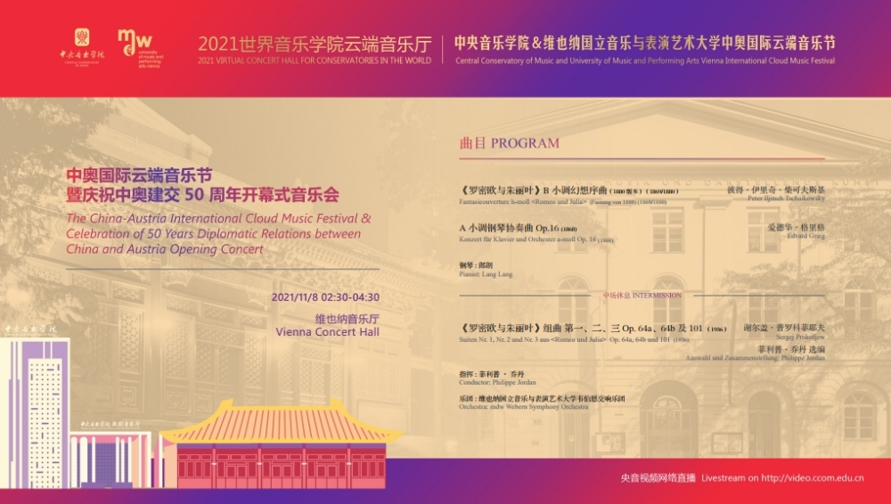 2021中奥国际云端音乐节是两校为了纪念中奥建交50周年共同举办的文化教育交流活动。音乐节将以线上线下的形式,连线两国首都——北京和维也纳,进行为期四天的音乐艺术与教育交流合作。包括在维也纳音乐厅举行的“开幕式音乐会”、双城“国际音乐线上大师班”和“中奥文化艺术管理论坛”,以及在北京中央音乐学院音乐厅举行的“闭幕式音乐会”四个主要部分。