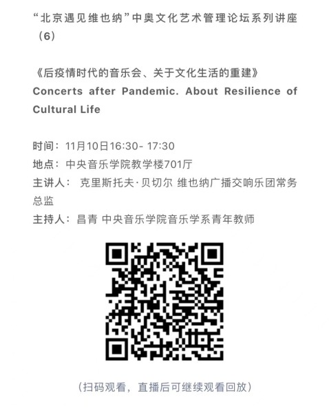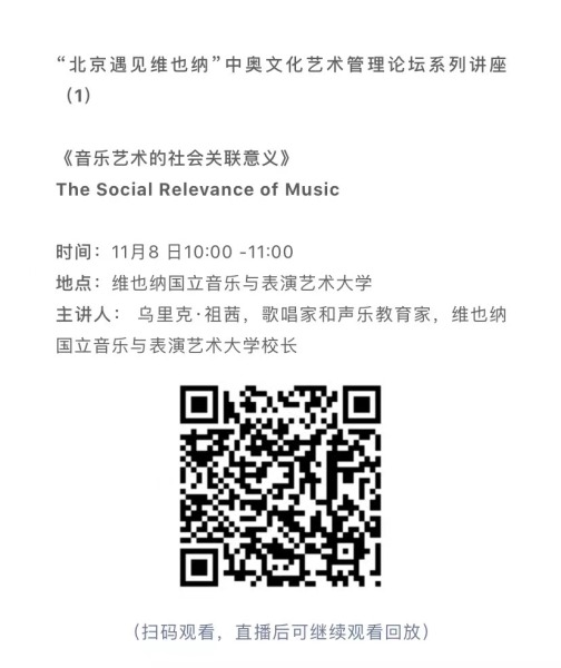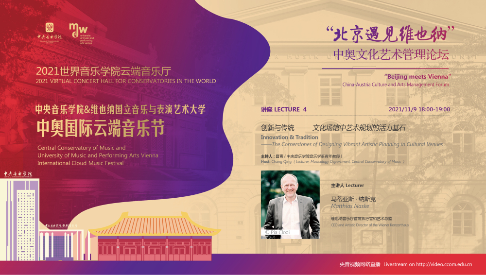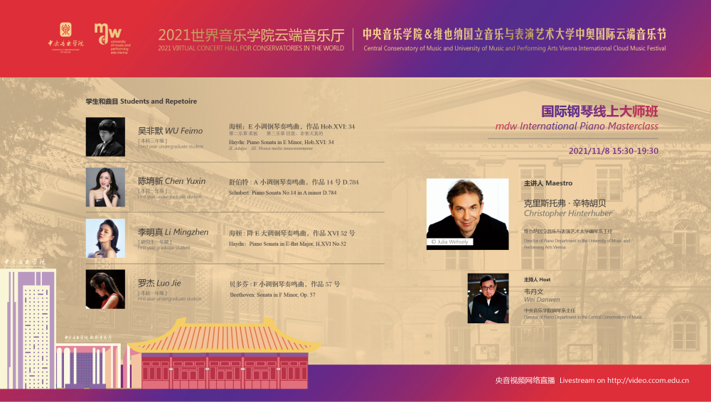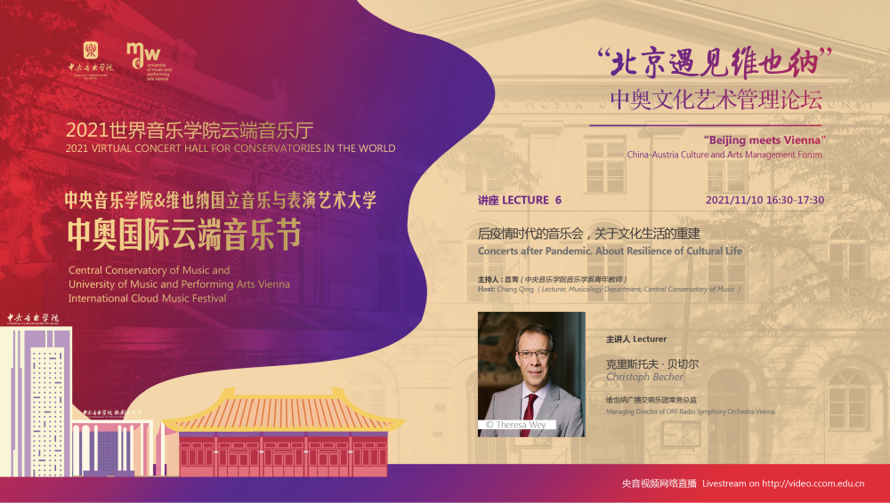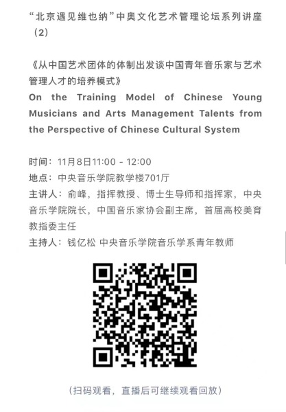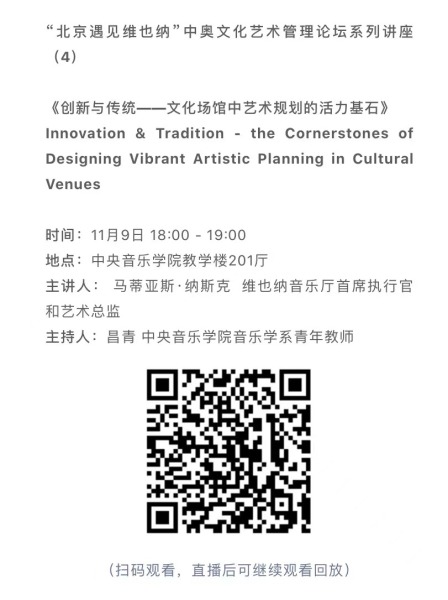 11月8日-10日期间的双城“国际音乐线上大师班”,将由维也纳国立音乐与表演艺术大学钢琴系主任克里斯托弗·辛特胡贝和中央音乐学院校长、指挥系博士生导师俞峰为双方学生授课;同时,在“中奥文化艺术管理论坛”上,中央音乐学院校长俞峰、维也纳国立音乐与表演艺术大学校长乌里克·祖茜、中央音乐学院教授和云峰、国家大剧院副院长赵铁春、维也纳音乐厅首席执行官和艺术总监马蒂亚斯·纳斯克、维也纳广播交响乐团常务总监克里斯托夫·贝切尔博士、中国交响乐团团长和首席指挥李心草、维也纳国立音乐与表演艺术大学文化管理及社会性别研究学院副院长卡瑟琳娜·普芬尼斯托夫、达格玛·阿布法尔特副教授和(欧洲)国际文化交流合作协会艺术总监姚瑶等中奥各领域的专业文化艺术管理专家和学者,将举办专题讲座和访谈节目,从不同的视角探讨文化艺术管理的内涵与外延。