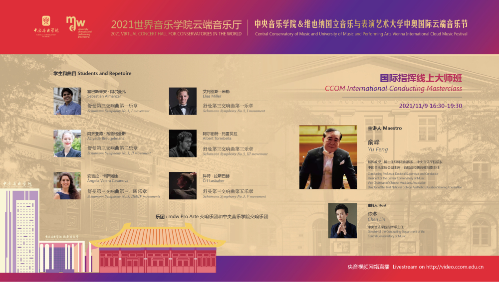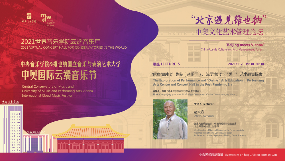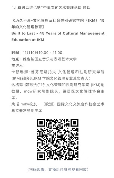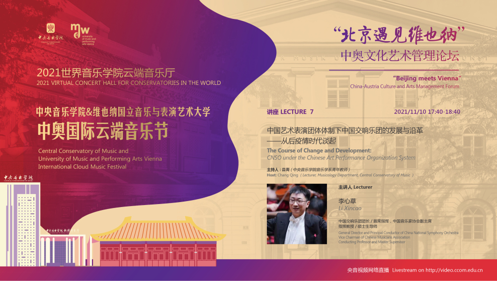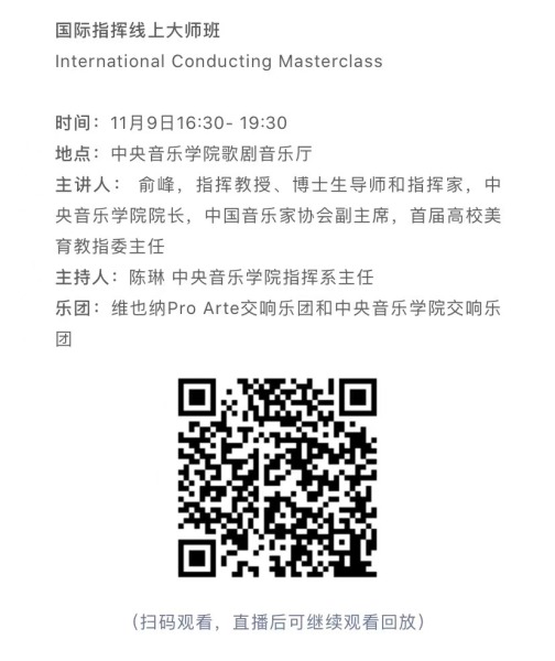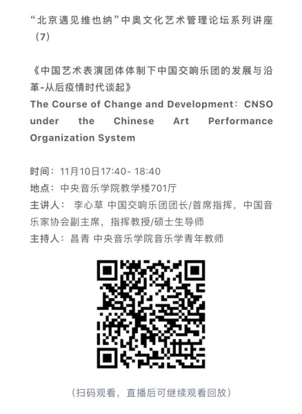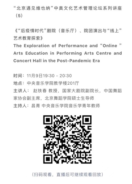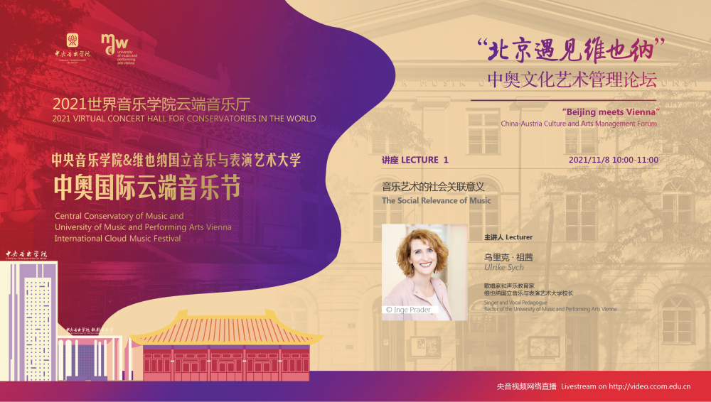 11月8日-10日期间的双城“国际音乐线上大师班”,将由维也纳国立音乐与表演艺术大学钢琴系主任克里斯托弗·辛特胡贝和中央音乐学院校长、指挥系博士生导师俞峰为双方学生授课;同时,在“中奥文化艺术管理论坛”上,中央音乐学院校长俞峰、维也纳国立音乐与表演艺术大学校长乌里克·祖茜、中央音乐学院教授和云峰、国家大剧院副院长赵铁春、维也纳音乐厅首席执行官和艺术总监马蒂亚斯·纳斯克、维也纳广播交响乐团常务总监克里斯托夫·贝切尔博士、中国交响乐团团长和首席指挥李心草、维也纳国立音乐与表演艺术大学文化管理及社会性别研究学院副院长卡瑟琳娜·普芬尼斯托夫、达格玛·阿布法尔特副教授和(欧洲)国际文化交流合作协会艺术总监姚瑶等中奥各领域的专业文化艺术管理专家和学者,将举办专题讲座和访谈节目,从不同的视角探讨文化艺术管理的内涵与外延。