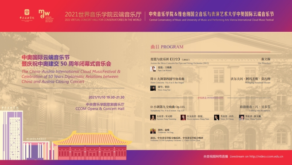 2021年,中国和奥地利迎来了建交50周年的历史性时刻,在这个特殊的年份中,两校更是积极响应,共同举行此次中奥“国际云端音乐节”。此次音乐节活动得到了中国驻奥地利大使馆、奥地利驻中国大使馆,维也纳市政府、维也纳音乐厅,中国艺术管理协会,中国国家大剧院,中国交响乐团、(欧洲)国际文化交流合作协会及欧中文化、教育与科学协会等多个中奥机构的大力支持。维也纳国立音乐与表演艺术大学校长乌里克·祖茜, 奥地利驻华大使利肯, 中国驻奥地利大使李晓驷,维也纳州议会第一议长恩斯特·沃勒纷纷发来视频致辞!