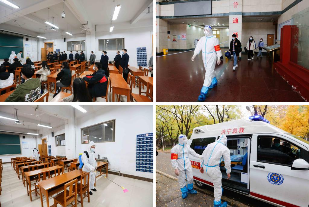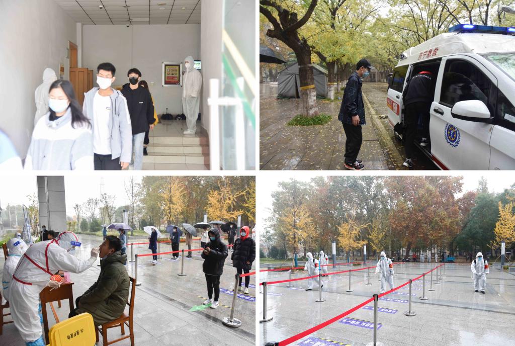 疫情防控工作人员带领学生穿好防护服,进入临时留观点,并进行心理安慰,定点医院120负压车赶到,现场转运阳性结果学生。同班同学进行信息登记,大楼师生按顺序有序离开教室。消杀人员对临时留观点、已撤离教室和公共区域进行终末消毒。该阳性学生经复检,结果仍为阳性,初步判定为无症状感染者,任课教师、同教室学生、同寝室居住舍友在疾控部门的转运下前往隔离点进行集中隔离。根据地方疾控部门要求,我校立即启动全员核酸检测,为便于学生快速检测,我校在研究生公寓等多处设置采样点。同时暂时封闭校园,除疾控部门、卫健部门人员、车辆,其他人员、车辆暂时禁止出入,师生就地等待,不流动,等待指令。