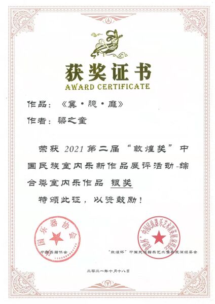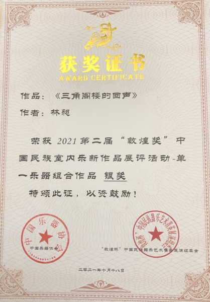 我校2011级作曲博士,现星海音乐学院现代音乐与戏剧学院副教授林昶《三角阁楼里的回声》获第二届“敦煌奖”中国民族室内乐新作品展评活动——单一乐器组银奖。