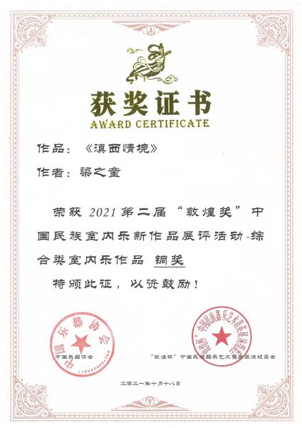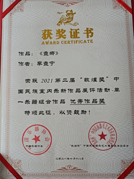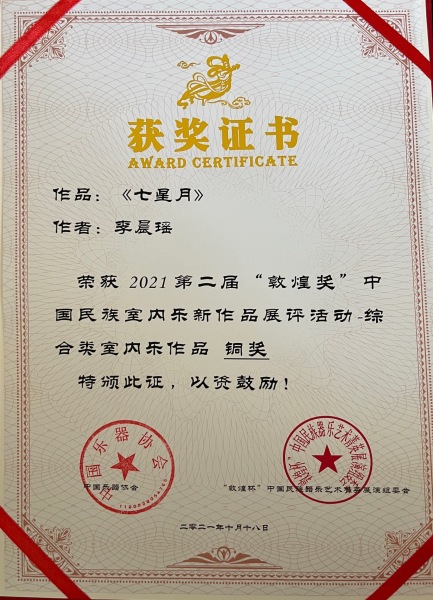 我校2020级作曲博士,李晨瑶作品《七星月》获第二届“敦煌奖”中国民族室内乐新作品展评活动——综合类室内乐作品铜奖。(指导老师:贾国平教授)
