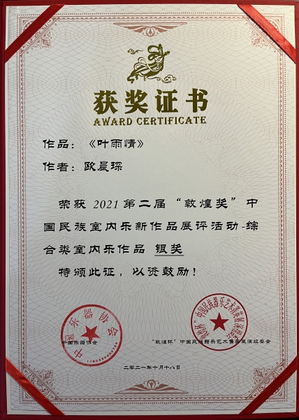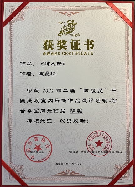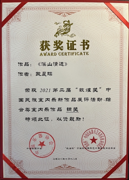 我校作曲系博士二年级在读学生欧晨琛凭借作品《叶雨情》《神人畅》和《溪山清远》获得一银两铜。(指导老师:贾国平教授)