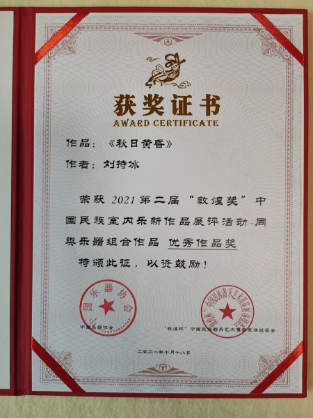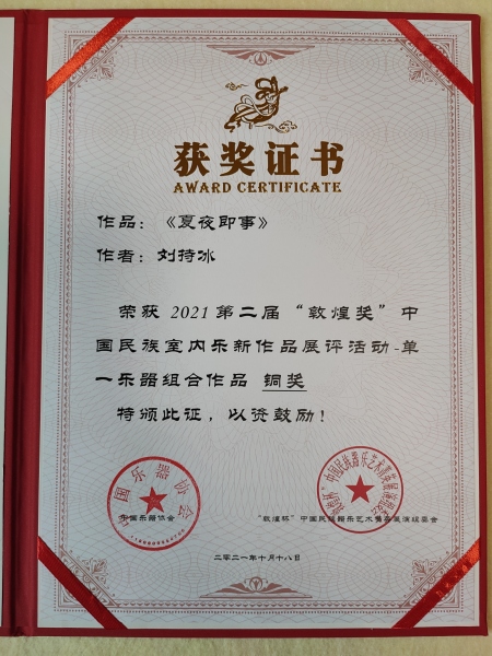 我校作曲系本科三年级在读刘持冰凭借作品《夏夜即事》和《秋日黄昏》分别获得铜奖和优秀作品奖。(指导老师:姚晨副教授)