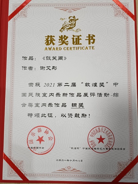 我校作曲系博士三年级在读学生谢艾彤凭借作品《谈笑间》获得铜奖。(指导老师:贾国平教授)