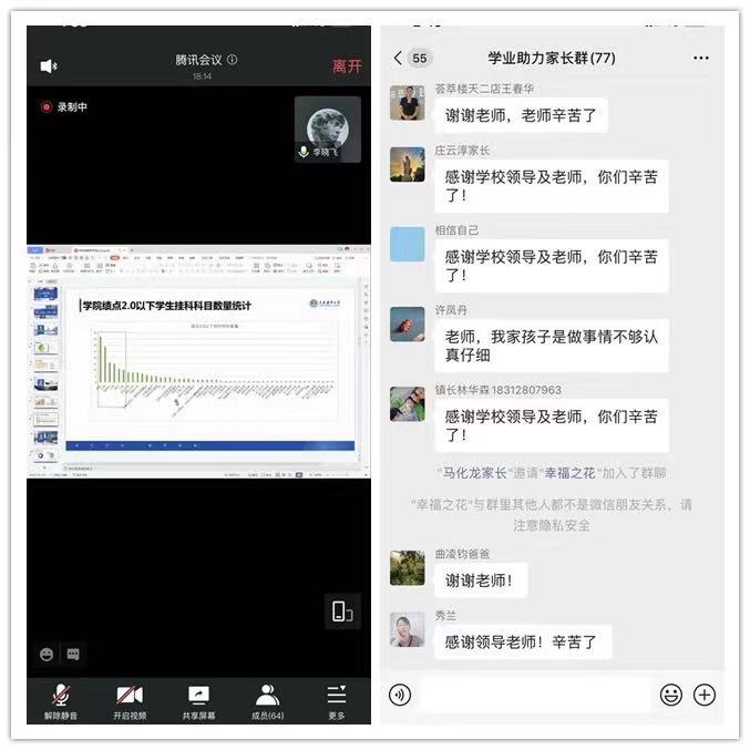 李晓飞向与会家长介绍了学院学风建设工作概况、学校学籍管理规定和专业培养计划。他从“绩点2.0以下面临着什么?”“学业困难学生的状态怎么样?”“产生学业问题的原因有哪些”三个层面对学业困难学生的状态、面临的困难和产生问题的原因进行了详细分析,使家长充分了解学生的在校情况。他着重介绍了学院拟采取的帮扶措施,一是实施“5+1”助学计划,即学生家长+一位学院领导+系主任+指导员+一名学生党员或积极分子帮助一个学业困难学生,通过精准制定帮扶计划、量化考核帮扶工作与定期评估,建立学业困难学生“一生一册”,形成助学合力;二是开展补课工作,一方面选拔朋辈讲师开展专业课知识补习,另一方面邀请专业课教师进行重点内容讲解和模拟测试;三是加强心理关怀和疏导,注重关心学业困难学生的心理健康,用好亲情、友情和师生情三把钥匙,打开学业困难学生的心门,帮助其提升对学习和生活的信心,提升内在动力。