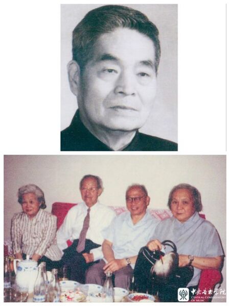 下,1981年5月来学校访问的著名作曲家赵元任(左2),与作曲系江定仙(右2)、姚锦新(右1)、萧淑娴(左1)教授合影。
