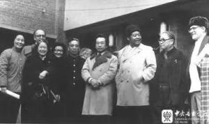 1977年11月12日,著名美籍华裔作曲家、美国哥伦比亚大学艺术学院副院长周文中(右4)访问我校。