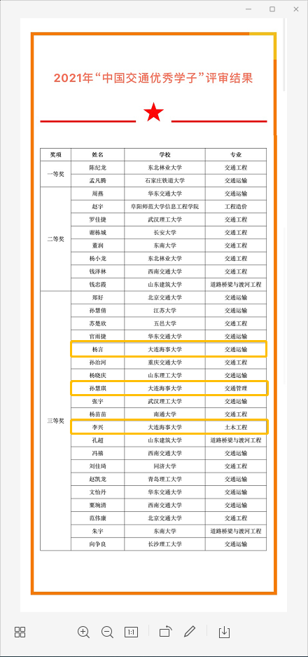 据悉,2021年“中国交通优秀学子”评选大赛总收到来自全国28所高校的69名2018级交通类本科生的评选材料,经专家评审,来自19所高校的30名候选人获奖,我校是获奖学生最多的院校之一。