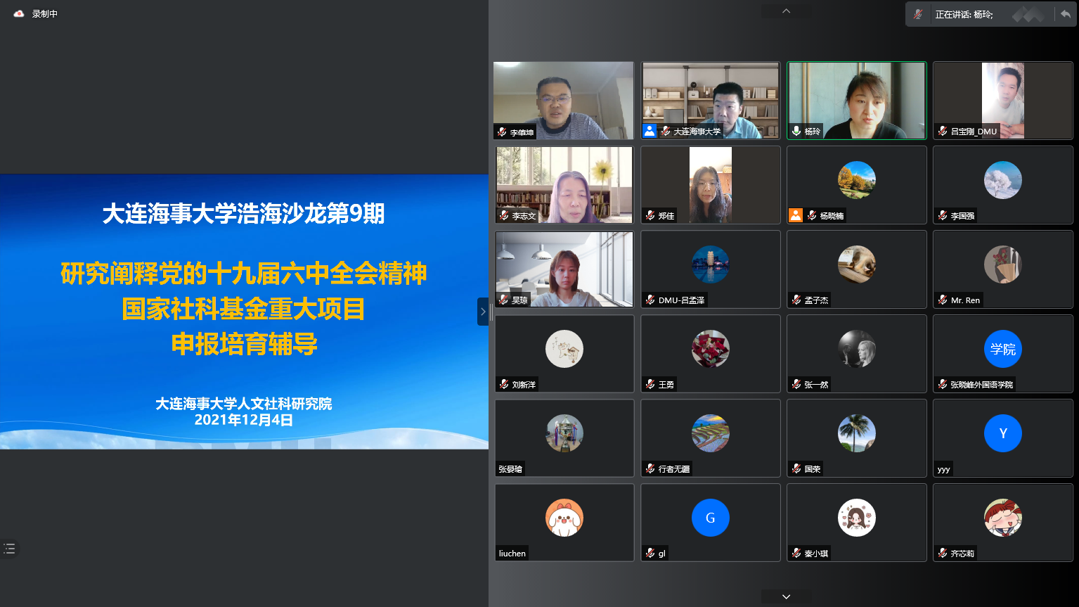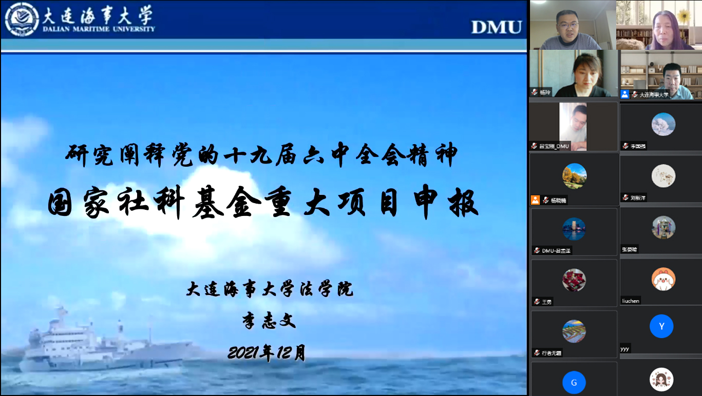 继续教育培训网首页为提前做好关于研究阐释党的十九届六中全会精神国家社科基金重大项目申报工作,进一步提高我校国家社科基金项目申报质量,根据《2022年度国家社科基金申报工作方案》总体安排,12月4日上午,我校2021年第九期浩海沙龙“研究阐释党的十九届六中全会精神国家社科基金重大项目申报培育辅导”于线上成功举办。人文社科研究院院长李肇坤、法学院李志文教授、本次重大项目申报以及感兴趣的专家教师参加了本次沙龙。沙龙由人文社科研究院副院长杨玲主持。