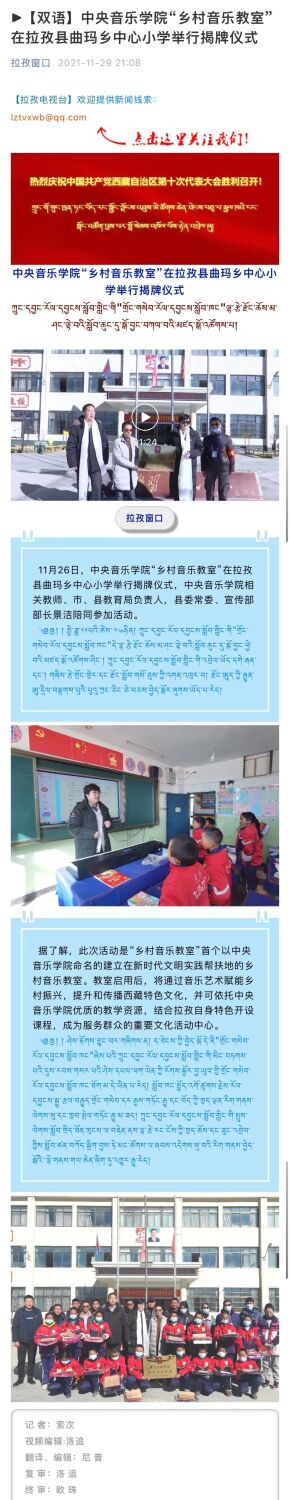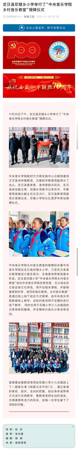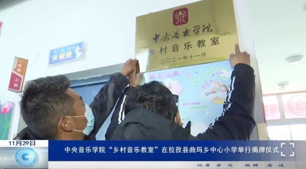 继续教育培训网首页11月25日和26日,“中央音乐学院乡村音乐教室”揭牌仪式分别在西藏日喀则定日县尼辖乡小学和拉孜县曲玛乡中心小学举行。中央音乐学院派驻日喀则新时代文明实践中心文艺宣讲师鲁颐诺、日喀则市教育局副局长丁志山,及定日县和拉孜县县教委、校长等参加了揭牌仪式。本次乡村音乐教室的设立,是我校继10月份在日喀则正式成立中央音乐学院新时代文明实践中心后,推进乡村振兴、帮扶当地文艺教育的又一扎实举措。教室启用后,将采用线上线下交互的方式,结合当地音乐文化特色开设课程,向小学生们输送中央音乐学院的优质艺术教学资源。