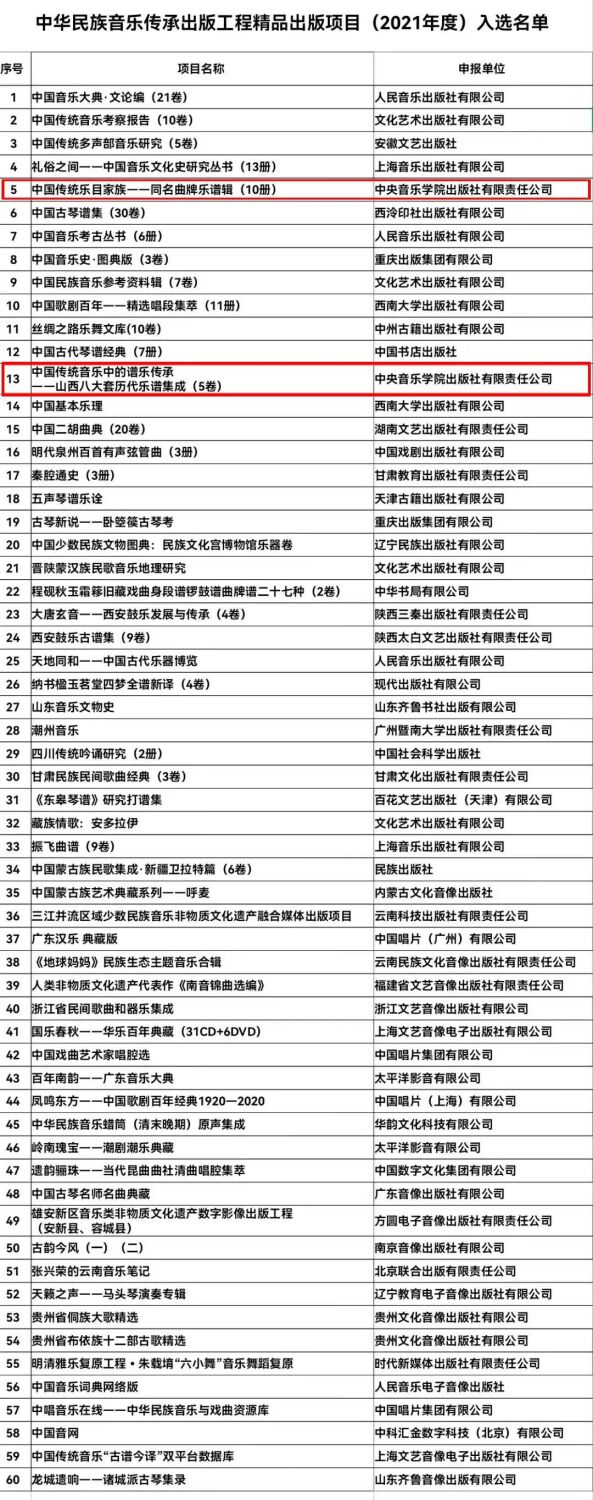 中央音乐学院出版社依托学校优质的学术资源以及专业的出版团队,所承担的多个重大项目在出版质量、社会效益、项目管理等方面表现突出。中央音乐学院出版社将继续努力,深入挖掘中国传统音乐文化的优质资源,积极回应时代的关切,不断增强“四个意识”,坚定“四个自信”,坚持守正创新,牢牢把握出版质量,力推更多中国音乐文化的精品力作。