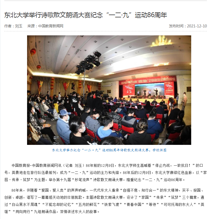 中国教育报-中国教育新闻网讯(记者 刘玉)86年前的12月9日,东北大学师生高喊着“停止内战,一致抗日!”的口号,英勇地走在游行队伍最前列,成为“一二·九”运动的主力和先锋。86年后的12月9日,东北大学赓续红色血脉,以“家园·传承·筑梦”为主题,举办第十九届“妙笔流声”诗歌散文朗诵大赛,隆重纪念“一二·九”运动86周年。