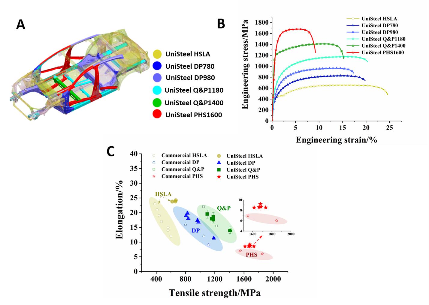 UniSteel概念体现了一种崭新的技术路径,巧妙的成分设计和传统物理冶金百年知识的累积,完美地实现了“成分”和“性能”之间的“1和N”映射关系。UniSteel可以灵活通过热处理获得性能优异的各种衍生钢种,解决了现今多钢种车身制造的大多数系统性的问题,有望革新全球汽车行业的车身制造模式,通过钢种的“素化”来降低钢质白车身设计、采购、生产和制造等各个环节的复杂性,在车身轻量化的同时大幅度降低车身用钢的碳排放,从而助力汽车行业早日实现碳中和。