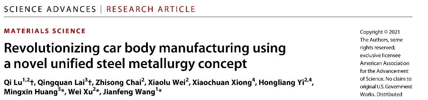 继续教育培训网首页近日,东北大学轧制技术及连轧自动化国家重点实验室师生在国际著名期刊Science子刊Science Advances上发表题为《UniSteel—革命性的钢车身制造概念》的论文。论文第一作者为通用汽车中国科学研究院高级研究员、东北大学客座教授卢琦博士;南京理工大学赖庆全副教授为共同第一作者;通讯作者为通用汽车中国科学研究院院长王建锋,东北大学轧制技术及连轧自动化国家重点实验室教授徐伟,轧制技术及连轧自动化国家重点实验室特聘教授、香港大学黄明欣教授。论文的作者还包括育材堂(苏州)材料科技有限公司熊小川博士和轧制技术及连轧自动化国家重点实验室易红亮教授,以及徐伟教授课题组的两位东北大学博士研究生柴志松和魏晓蓼。该论文提出了以单一钢铁合金成分取代已有繁多的汽车钢种成分,即UniSteel概念。