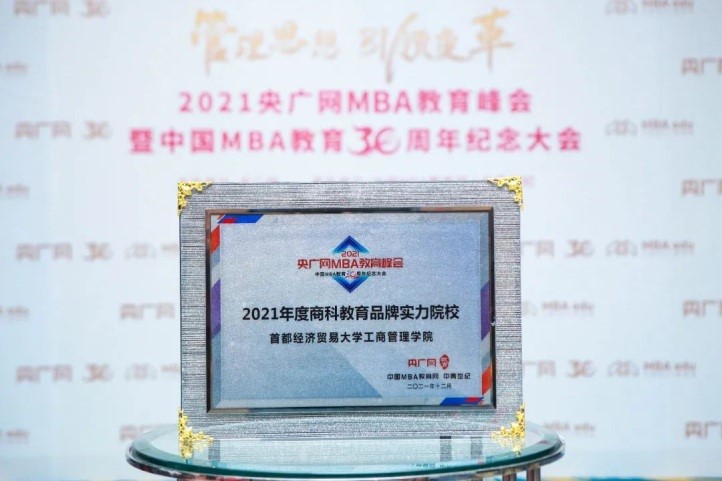 继续教育培训网首页12月24日,“2021央广网MBA教育峰会暨中国MBA教育三十周年纪念大会”在北京隆重召开。为致敬中国MBA教育30周年,表彰和激励商科教育领域内的优秀头部力量,会议颁布了多类荣誉奖项。工商管理学院喜获“2021年度商科教育品牌实力院校”奖项。