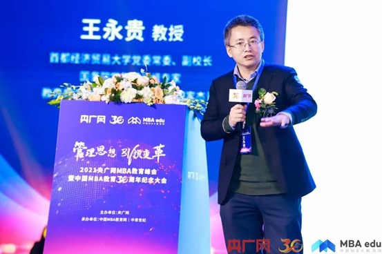 本次会议以“管理思想·引领变革”为主题,采取线上线下相结合的形式进行。三十年栉风沐雨,三十年春华秋实,来自国内外各界领导、优秀商科院校代表、行业领军人物、企业大咖等共此盛时、共襄盛典。会上,北京大学国家发展研究院院长、北大博雅特聘教授、北京大学中国经济研究中心主任、北大南南合作与发展学院执行院长姚洋教授;我校党委常委、副校长,国务院学科评议组专家、教育部工商管理教指委委员、国家杰青王永贵教授;中国人民大学商学院原院长毛基业教授;北京大学校务委员会副主任、北京大学汇丰商学院创院院长,北京大学原副校长海闻教授依次进行了主题演讲。王永贵以“中国MBA项目的转型升级之路”为题,讲述了中国MBA项目的发展历程,以及百年未有之大变局下MBA教育转型升级的方向与路径。
