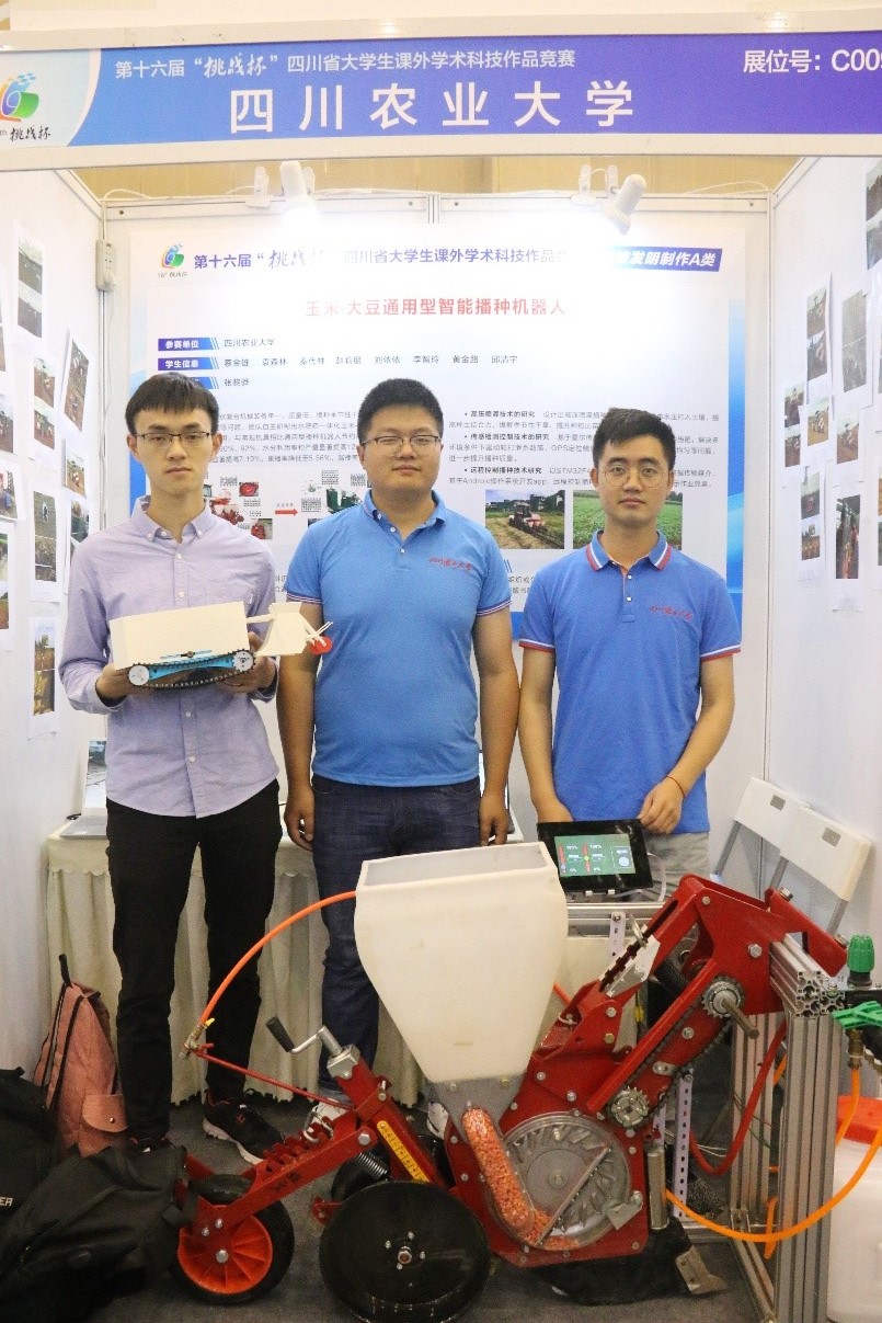 《玉米-大豆水肥药一体化智能播种机》针对玉米大豆带状复合种植专用播种机功能单一、智能化程度低,四川玉米、大豆播种期间干旱出苗差等问题,团队自主研制出水肥药一体化玉米-大豆通用型智能播种机。与抽水浇灌播种相比可节水80%。玉米、大豆出苗率分别提升至85%、78%,地上部分干物质积累量显著提高7.19%,重播率低于10.26%,漏播率低于7.41%。目前团队已申请专利9项,发表论文5篇,立项国家级创新训练计划1项,并与多家企业签订合作协议。