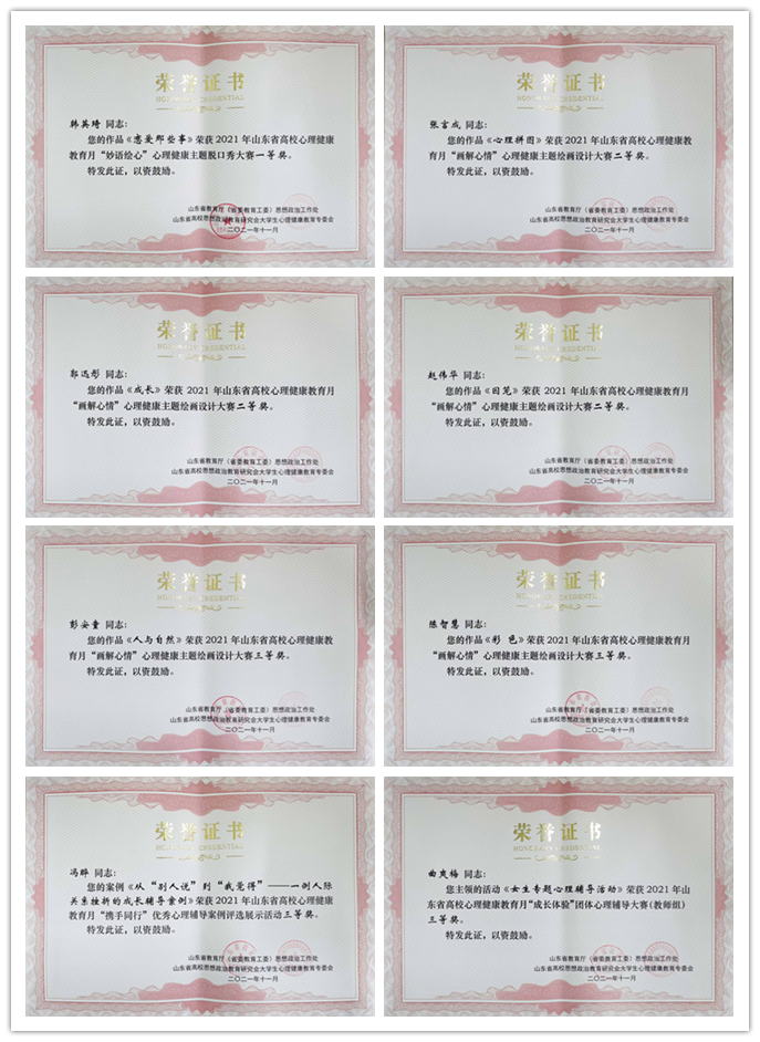 继续教育培训网首页近日,山东省教育厅思想政治工作处、山东省高校思想政治教育研究会大学生心理健康教育专委会发布《关于公布2021年山东省高校心理健康教育月展示活动评选结果的通知》,齐鲁工业大学(山东省科学院)再获佳绩,获得省一等奖1项、二等奖3项、三等奖4项。