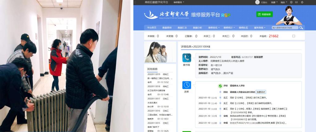 1月10日上午11:00,接诉即办服务大厅收到求助信息,教一楼暖气管跑水了,客服人员第一时间联系维修人员,保洁人员进行扫水清理,紧急抽调其他人员和设备赶到现场支援。在“接诉即办”服务中心的协调下,后勤物业中心、热力中心、新宇物业多部门拧成一股绳,于11:40高效完成维修,楼道与室内积水也全部清扫干净。